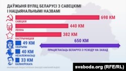 У той жа час вуліц з нацыянальнымі назвамі ў Беларусі ў 10-20 разоў меней, чым з савецкімі. Даўжыня ўсіх вуліц Каліноўскага складае 33 км, Скарыны — 49, Незалежнасьці — 40.