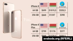Калі ў Амэрыцы цэны на iPhone 8 пачынаюцца ад 699 даляраў, то ў Беларусі афіцыйныя прадаўцы прапаноўваюць гэты тэлефон ад 1019,5 даляраў (2039 рублёў). Максымальная ж розьніца паміж беларускім і амэрыканскім рынкам складае 430 даляраў за iPhone 8 Plus на 256 Gb.