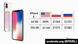 Таньней за ўсё з краін-суседзяў будзе набыць тэлефон у Польшчы. Максымальная розьніца з амэрыканскім рынкам складае 426 даляраў. Варта адзначыць, што розьніца паміж афіцыйнымі цэнамі на iPhone X у Польшчы і Расеі складае 6-8 даляраў.