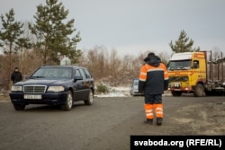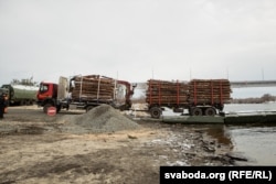 «Тут любы транспарт можа праехаць, — расказвае адзін зь іх. — Вось толькі што прапусьціў фуру вагой 38 тон, так у дакумэнтах кіроўцы было пазначана. Больш за 40 тон мы не пускаем, хоць пантоны і 60 могуць вытрымаць. Што тут вясной будзе, калі рака разьліецца? Ня ведаю. Вады тут будзе да той дамбы (паказвае рукой далёка ўбок). Відаць, трэба будзе новую пераправу рабіць».
