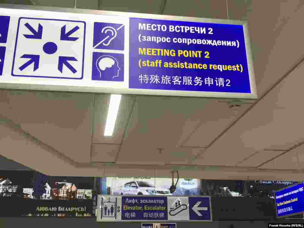 Як раней паведамляла Свабода, на электронным табло ў менскім міжнародным аэрапорце, у дадатак да расейскай, ангельскай і кітайскай, зьявілася і беларуская вэрсія. А цяпер і на некаторых указальніках дадалі беларускую мову. Ці плянуецца ўсе шыльды замяніць на чатырохмоўныя — пакуль невядома.