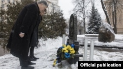 Пятро і Марына Парашэнкі таксама запалілі і паставілі лампадкі ля памятнага знака Героям Нябеснай Сотні на вуліцы Грушэўскага.