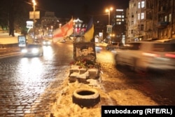 Кіяўляне сёньня прыйшлі ўшанаваць першых ахвяраў Рэвалюцыі Годнасьці — Міхася Жызьнеўскага ды Сяргея Нігаяна. Яны прынесьлі кветкі да сымбалічных помнікаў. На фота — саматужны помнік Міхасю Жызьнеўскаму на вуліцы Грушэўскага ў цэнтры Кіева.