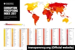 Мапа сьвету паводле Індэксу ўспрыняцьця карупцыі ад Transparency International, 2017