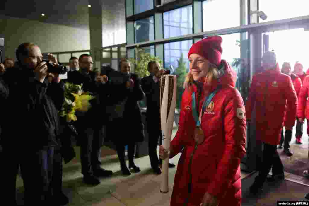 Алімпійская чэмпіёнка ў фрыстайле Ганна Гуськова разам з камандай беларускіх паветраных акрабатаў вярнулася ў Беларусь. Іх урачыста сустрэлі ў Нацыянальным аэрапорце.
