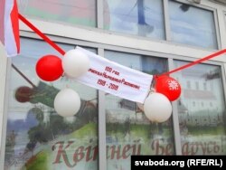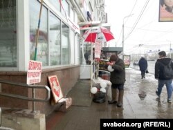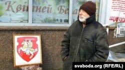 «Працоўнае месца» вядомага віцебскага распаўсюдніка незалежнага друку сёньня выглядае незвычайна: апрача століка з часопісамі пад бел-чырвона- белым парасонам, тут і выява «Пагоні», і «вышыванка-віншаванка».
