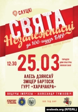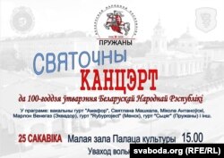 Пружанская раённая арганізацыя Таварыства беларускай мовы імя Францішка Скарыны запрашае на ўхвалены ўладамі сьвяточны канцэрт, прысьвечаны 100-годзьдзю з дня ўтварэньня Беларускай Народнай Рэспублікі.
