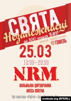 ​У абласным цэнтры нарэшце вызначыліся з пляцоўкай для сьвяточнага канцэрту 25 сакавіка да 100-годзьдзя БНР. Выступы музыкаў пройдуць у арт-прасторы «Каўчэг» (праспэкт Перамогі, 2а). Пачатак а 18-й гадзіне. Запрошаныя гурт N.R.M. зь Менску і гомельская бард-сьпявачка Вальжына Цярэшчанка.