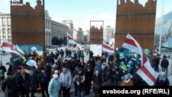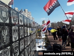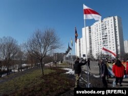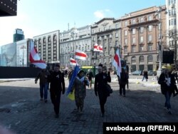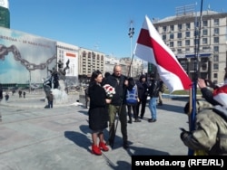 Удзельнікі акцыі прайшлі пад бел-чырвона-белымі сьцягамі з плошчы Незалежнасьці да вуліцы Грушэўскага — месца гібелі беларуса Міхайла Жызьнеўскага і ўсклалі кветкі.