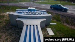 Бэтонная стэла з надпісам «Шчасьлівай дарогі» і гербам Горадні на выезьдзе з гораду ў бок Індуры, відаць, ня вытрымала парываў моцнага ветру.
