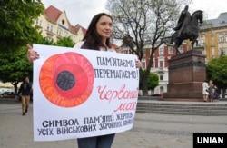 Ва Ўкраіне больш як два дзесяцігодзьдзі пасьля атрыманьня незалежнасьці сымбалем ушанаваньня Другой усясьветнай вайны, якая тады, як і ва ўсіх іншых постсавецкіх краінах, па інэрцыі яшчэ называлася Вялікай Айчыннай, была георгіеўская стужка. Пасьля анэксіі Расеяй Крыму і пачатку расейскай узброенай агрэсіі на Данбасе ў 2014 годзе стужку пачалі ўспрымаць як сымбаль «русского мира», а ўжо ў 2015 годзе ад яе адмовіліся афіцыйна на карысьць кветкі маку.