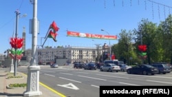 І — ніводнай выявы паласатай чорна-жоўтай стужкі, якая зьяўляецца галоўным сымбалем сьвяткаваньня Дня Перамогі ў Расеі. У Маскве сваё сьвята, у Менску — сваё.