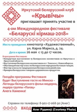 Клюб «Крывічы» з расейскага Іркуцку завяршае падрыхтоўку да IV фэстывалю «Беларускі кірмаш-2018». Імпрэза адбудзецца 26 траўня ў гарадзкім кінатэатры «Художественный», уваход вольны.