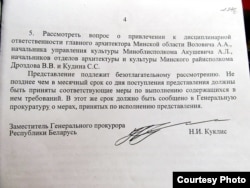 Прадстаўленьне генэральнай пракуратуры пра праверку будаўніцтва рэстарана ў Курапатах