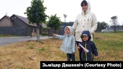 Наста і Зьміцер Дашкевічы, разам з дачкою Марай і сынам Давідам, пратэстуюць супраць рэстарану ў Курапатах. Здымак Зьмітра Дашкевіча.