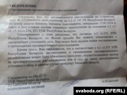 У канцы траўня сям’я Міхаіла Бяўзюка другі раз атрымала паведамленьне аб тым, што ў сьмерці іх сына ня знойдзена крымінальнага сьледу і справа закрытая.
