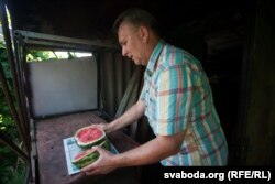 Мікола Таранда працуе на лецішчы ўжо гадоў трыццаць. Але раней ня мог сабе ўявіць, што некалі будзе зьбіраць кавуновы ўраджай.