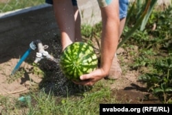 «Пытаўся ў гарадзенцаў, тыя казалі, што ня надта ўдавалася (вырошчваць кавуны. — РС). Нехта цяпер піша, што ў яго вырасьлі — памерам як яблыкі», — кажа дачнік.