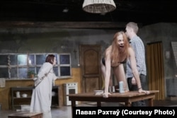 Фота Жэні Чарняўскага і Паўла Рэхтава. Перададзены рэжысэрам спэктакля Віталём Краўчанкам і Гомельскім гарадзкім моладзевым тэатрам.