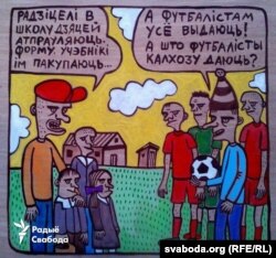 Чаму людзі, якія сядзяць на ўсім гатовым, ня могуць пацэліць у вароты? Вэрсія народных герояў мастака Аляксея Хацкевіча — Сашы і Сірожы.