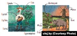 На кожнай карцінцы сабраныя некалькі словаў на адну і тую ж літару, якія складаюць цэльны сюжэт. Чытаючы разам зь дзіцем азбуку, бацькі могуць уводзіць невялікі інтэрактыў: прасіць знайсьці на малюнку ўсе прадметы і герояў на пэўную літару».