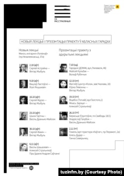 Пасьля заплянаваныя лекцыі пра Вацлава Ластоўскага, Сяргея Мурзо, Цішку Гартнага, Сяргея Фаміна, Васіля Шашалевіча (усе ў Менску), Майсея Кульбака (у Горадні), Юрку Лявоннага (у Магілёве), Міхася Зарэцкага (у Віцебску), Уладзіслава Галубка (у Берасьці) і Алеся Дудара (у Гомлі).
