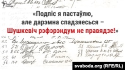 Падышоў я і да Аляксандра Лукашэнкі. «Сяргей, маю пазыцыю ты ведаеш, я за калектыўную бясьпеку, але подпіс пастаўлю. Толькі ты дарэмна спадзеясься, Шушкевіч рэфэрэндум не правядзе!» — сказаў Лукашэнка і паставіў подпіс, 52-гі па ліку. «Ну-ну, лічы як хочаш, — падумалася. — Ты ж ня ведаеш, што мне сказаў дарадца Шушкевіча, Сьцяпура».