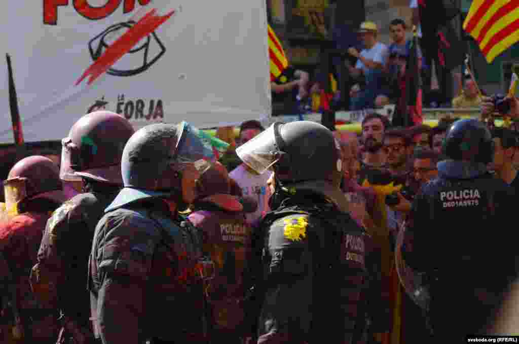 У сваю чаргу прыхільнікі незалежнасьці зранку 29 верасьня сабраліся на контрадэманстрацыю. Каталёнская паліцыя Mossos паставіла кардоны і ахоўвала шэсьце прыхільнікаў нацыянальнай паліцыі, каб не дапусьціць сутыкненьняў. У мясцовых паліцыянтаў кідалі ёмістасьці з фарбай, адбыліся бойкі паміж прыхільнікамі незалежнасьці і паліцыянтамі.