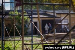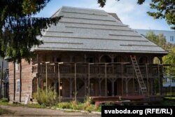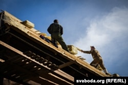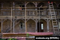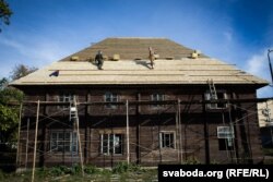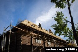 Цяпер рабочыя перакрываюць дах. Старую дахоўку зьнялі раней, а замест яе кладуць сьвежыя драўляныя гонты — пласьціны 70×12 сантымэтраў. З фасаднай часткі дах ужо пераклалі.