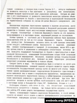 Нават «профільная» камісія Вярхоўнага Савету па пытаньнях нацыянальнай бясьпекі, абароны і барацьбы са злачыннасьцю (заўважым — на першым месцы «нацыянальная бясьпека»), якую ўзначальваў Мечыслаў Грыб, — нават яна такой інфармацыі ня мела, і старшыня КДБ на даклады да кіраўніцтва парлямэнцкай камісіі не хадзіў. Ведаю таксама, што ніколі парлямэнцкая Камісія па пытаньнях галоснасьці, сродкаў масавай інфармацыі і правах чалавека, членам якой я зьяўляўся, ня мела дакладаў з КДБ (натуральна, я не бяру ў разьлік нашу перапіску ў справе рэабілітацыі рэпрэсаваных).