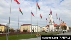 Плошча ў сьцягах Беларусі і Расеі. Расейскай афіцыйнай сымболікі ў Магілёве поўна. Расейскімі і беларускімі сьцягамі абвешаныя ўсе ліхтарныя слупы ўздоўж цэнтральных вуліц. Лунаюць трыкалёры і на дзяржаўных будынках.