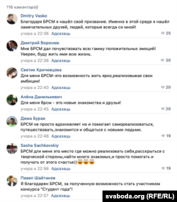 Афіцыйная суполка БРСМ «УКантакце» заклікала сяброў дзяліцца перавагамі арганізацыі пад хэтштэгам #загонБРСМ. Апублікаваны Свабодай ролік з аўдыё, як у менскай 31-й гімназіі настаўнікі прымушаюць вучняў уступіць у БРСМ, прагледзелі больш як паўмільёна разоў.