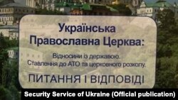 «Сярод іншага на працягу двух сутак канфіскавана 75 асобнікаў брашуры "Украінская праваслаўная царква: Адносіны зь дзяржавай. Стаўленьне да АТА і царкоўнага расколу. Пытаньні і адказы", ужо трапляла ў поле зроку СБУ, і на якую ўжо ёсьць адпаведнае заключэньне экспэрта», — пазначана ў паведамленьні.