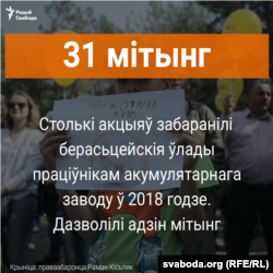Улады Берасьця адхілілі адразу дзьве заяўкі на мітынгі супраць будаўніцтва акумулятарнага заводу каля гораду. Агулам за год у Берасьці забаранілі 31 мітынг, дазволены быў толькі адзін, сказаў Свабодзе берасьцейскі праваабаронца Раман Кісьляк.