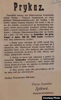 «Прыказ аб дармаедах» 1916 году стаў вядомы летась. Гэта быў адзін з экспанатаў выставы «Бывай, мільянэр!», перадаваў «Твой стыль». Надрукаваны беларускай лацінскай, «Prykaz» быў выдадзены нямецкай адміністрацыяй 3 сакавіка 1916 году. Ён распаўсюджваўся на «крэпасны рэён Гродны» і «рэён Этапнай Інспэкцыі ХІІ Арміі».