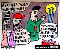 «Як такое можа быць? Абагнаў усіх алімпіяднікаў!», — не разумеюць Саша і Сірожа, наіўныя пэрсанажы мастака Аляксея Хацкевіча.