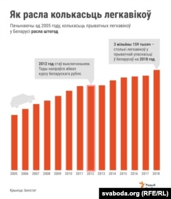 Пачынаючы ад 2005 году колькасьць прыватных легкавых аўтамабіляў у Беларусі павялічвалася штогод. Выключэньне склаў толькі 2012 год, калі курс беларускага рубля адносна даляра абваліўся.
