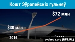 Вядома, што на Эўрагульні ў Менску патрацяць мінімум 72 мільёны даляраў. Толькі адкрыцьцё і закрыцьцё будзе каштаваць 12 мільёнаў даляраў. Пад Эўрагульні набудуць таксама люстэркі, паліцы ды іншае новае абсталяваньне ў студэнцкую вёску, адкуль пад гульні адсялілі 4 тысячы студэнтаў.