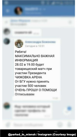 Арганізацыя БРСМ геаграфічнага факультэту Беларускага дзяржаўнага ўнівэрсытэту шукала сярод студэнтаў 500 чалавек, якія б схадзілі 28 лютага на хакейны матч з удзелам Аляксандра Лукашэнкі.