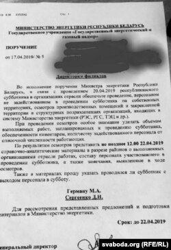 У сваю чаргу генэральны дырэктар установы «Дзяржаўны энэргетычны і газавы нагляд» Аляксандар Азярэц разаслаў даручэньні дырэктарам філіялаў забясьпечыць яго па выніках суботніка «даведачна-аналітычным» матэрыялам пра аб’ём выкананай працы, колькасьць задзейнічанага пэрсаналу. Ён патрабуе, каб адпрацавалі менавіта ў суботу, а ня ў іншыя дні.