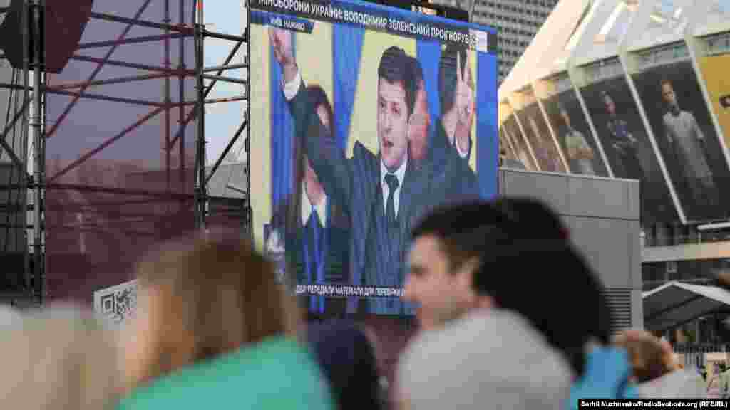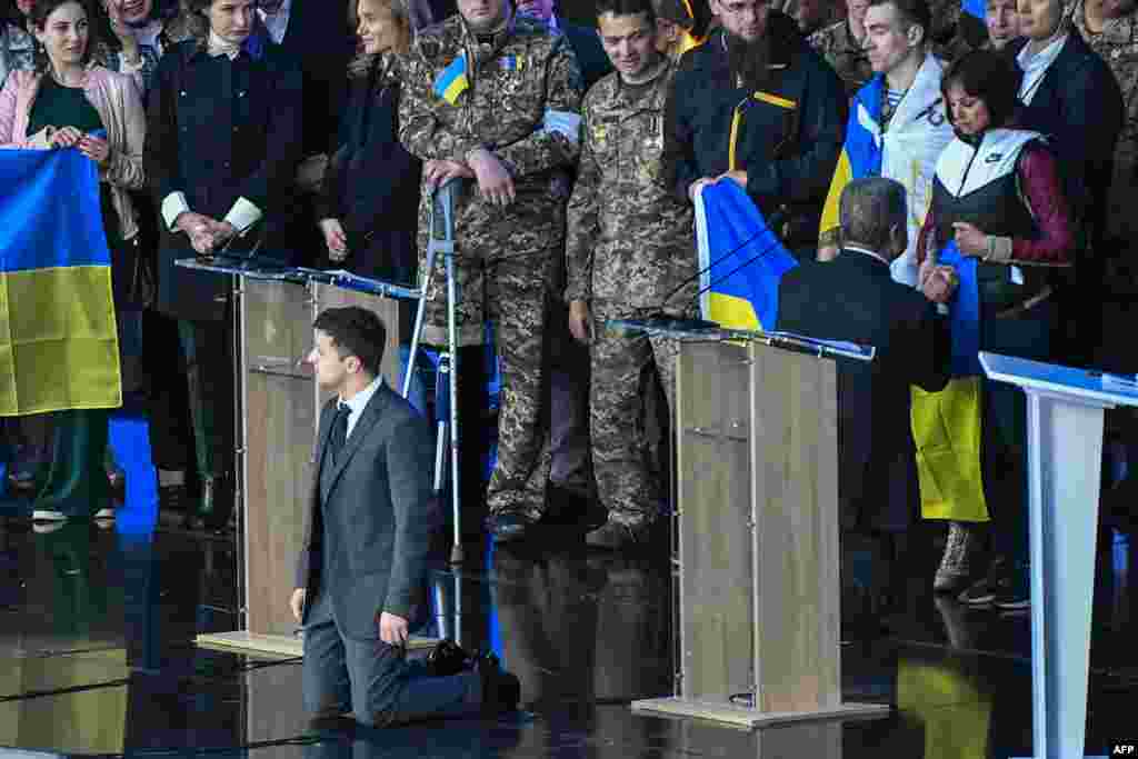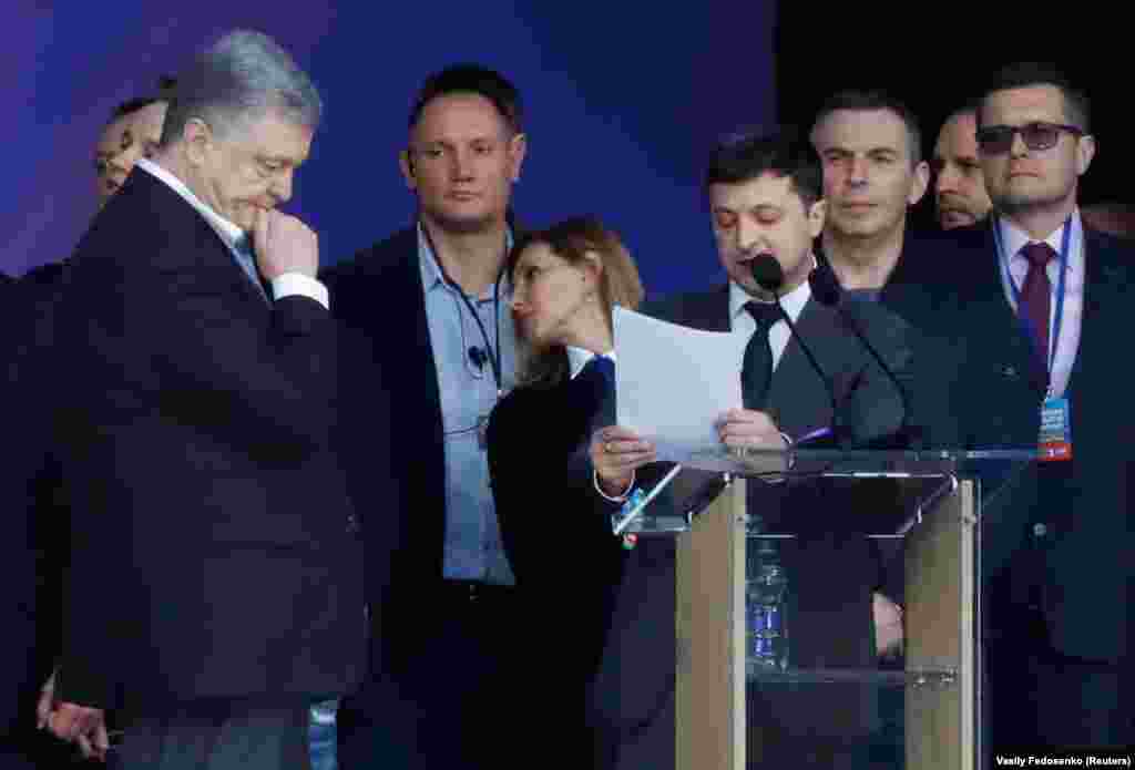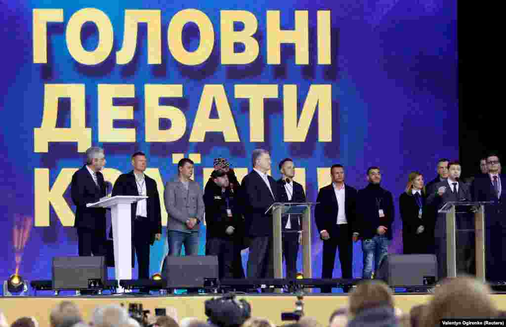 Дэбаты кандыдатаў на прэзыдэнта Пятра Парашэнкі і Ўладзіміра Зяленскага прайшлі 19 красавіка. Палітыкі сустрэліся на кіеўскім стадыёне «Алімпійскі». Пасьля заканчэньня дэбатаў Парашэнка правёў мітынг на іншым баку стадыёну.