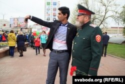 Удзельнікі з партрэтамі сабраліся за гадзіну да пачатку афіцыйных сьвяткаваньняў і раздавалі ўсім ахвотным георгіеўскія стужкі. Агулам у шэрагах «Несьмяротнага палка» сабралася некалькі дзясяткаў чалавек, у тым ліку прадстаўнікі казацтва і грамадзкага аб’яднаньня «Русский дом» на чале з кіраўніком Андрэем Герашчанкам.