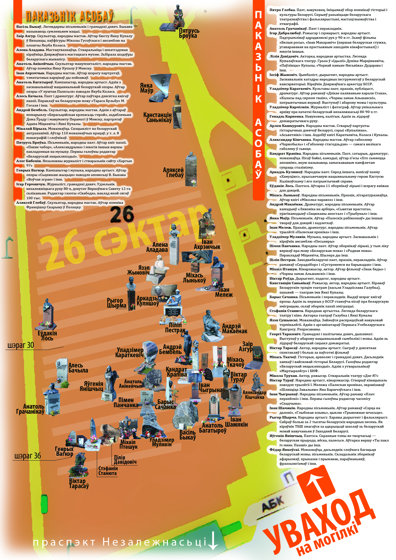 30. Андрэй Макаёнак. Драматург, народны пісьменьнік. Аўтар камэдыяў «Лявоніха на арбіце», «Сьвятая прастата», трагікамэдыяў «Зацюканы апостал» і «Трыбунал» і інш.