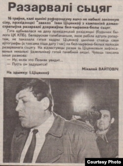 «Ініцыятарамі былі актывісты Партыі аматараў піва і Задзіночаньня беларускіх студэнтаў, — працягвае Сяргей Чырык. — Многіх тады пахапалі, у тым ліку мяне, тэлежурналістку Вольгу Акуліч — я якраз падпрацоўваў для праграмы „Крок“. Пашанцавала, што быў кандыдатам у дэпутаты гарсавету, дык ня толькі адпусьцілі, а адвезьлі туды, дзе ўзялі. Але, ужо навучаная горкім вопытам і каб ня страціць адзьнятае, пакуль пакавалі ў кутузку, Вольга засунула касэту... у трусы. Балазе, не абшуквалі».