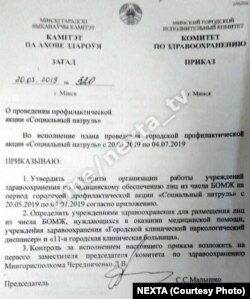 NEXTA апублікаваў копію дакумэнта, які вельмі нагадвае загад камітэту аховы здароўя Менгарвыканкаму. Згодна зь ім, гарадзкі клінічны наркалягічны дыспансэр і 11-я гарадзкая клінічная лякарня прызначаны «для разьмяшчэньня асобаў зь ліку БОМЖ, якія маюць патрэбу ў аказаньні мэдыцынскай дапамогі».