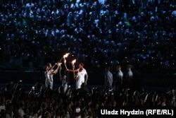 Запаліць агонь над паходняй «Дынама» даверылі групе беларускіх алімпійскіх чэмпіёнаў — Дар’і Домрачавай, Надзеі Скардзіна, Анатолю Грышыну, Максіму Мірнаму і іншым.