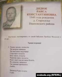 «Мая бабуля пражыла 97 гадоў. Яна ня ведала ні дактароў, ні лякарняў. Лячылася толькі зёлкамі. Я зь дзяцінства назірала, як мая бабуля дапамагала дзеткам — ад крыксаў ці сурокаў. Я бачыла, як дзіця крычыць, стаіць прутам і ня можа ноччу спаць. Бабка пачытае над ім замову — і дзіця засынае. Я ва ўсё веру», — кажа дырэктар музэю.