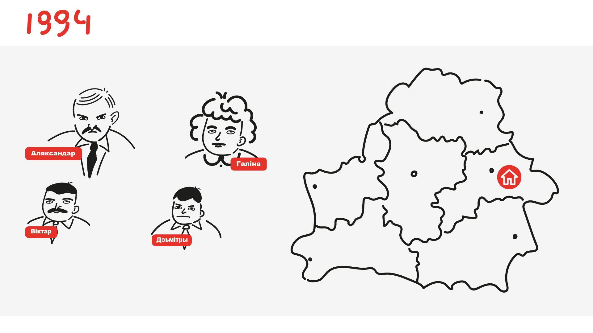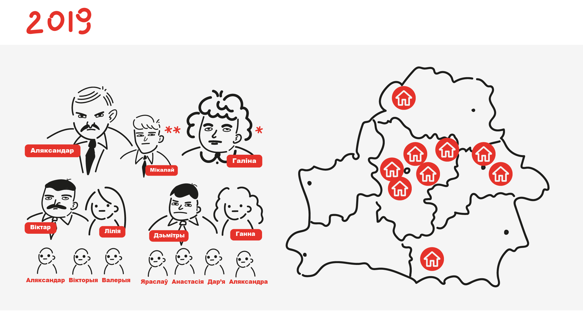 Сям’я Лукашэнак у 1994 годзе складалася з чатырох чалавек: бацька, маці і два сыны. Яны мелі адзін дом плошчай 55 квадратных мэтраў у вёсцы Рыжкавічы пад Шкловам. Колькі людзей у прэзыдэнцкай сям’і сёньня? На колькі вырасла ягоная гаспадарка? Паказваем адной карцінкай.