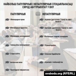 Сёлета ў сельскагаспадарчых ВНУ недабор і таму прахадны бал меншы за 100. А на некаторыя спэцыяльнасьці БДУ, мэдыцынскага і лінгвістычнага ўнівэрсытэтаў прахадны бал пераваліў за 370.
