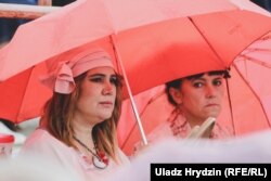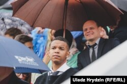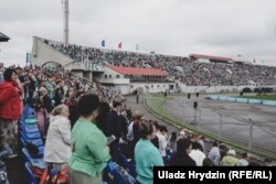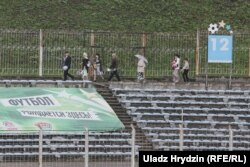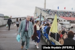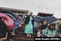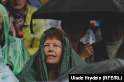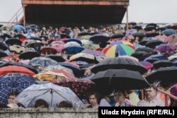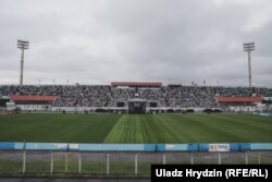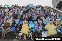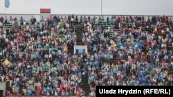 Стадыён «Трактар» адкрыты, тут лёгка можна трапіць пад дождж. Але калі той пачынаецца, людзі не сыходзяць, раскрываюць парасоны.